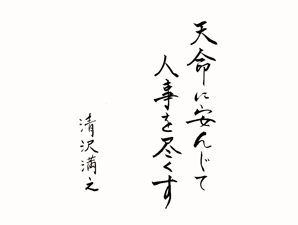 よく聞くのは「人事を尽くして天命を待つ」ですが、清沢満之は「ありのままの自分を受け入れ最善を尽くす」という意味で「天命に安んじて人事を尽くす」と言っています。これは落在するという事です。人間の小さな自我(自力)に任せるのではなく、生かされている(他力)自分に気付け。なるべき様になるのだから安心して全力で生きようと言っています。 |