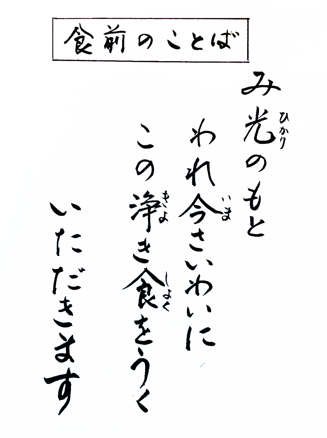 命ある限り何かを口にしなくては生きて行けない私達です。飽食の時代と言われて久しいのですが、相変わらず私達はあらゆる物を貪ってはいないでしょうか?日に三度の食事が餌にならないように、折々に自分に問うています。 私の命をつなぐためここに届いたあらゆる生命と、関わってくださったご縁に対して「いただきます」「ごちそうさま」 |
